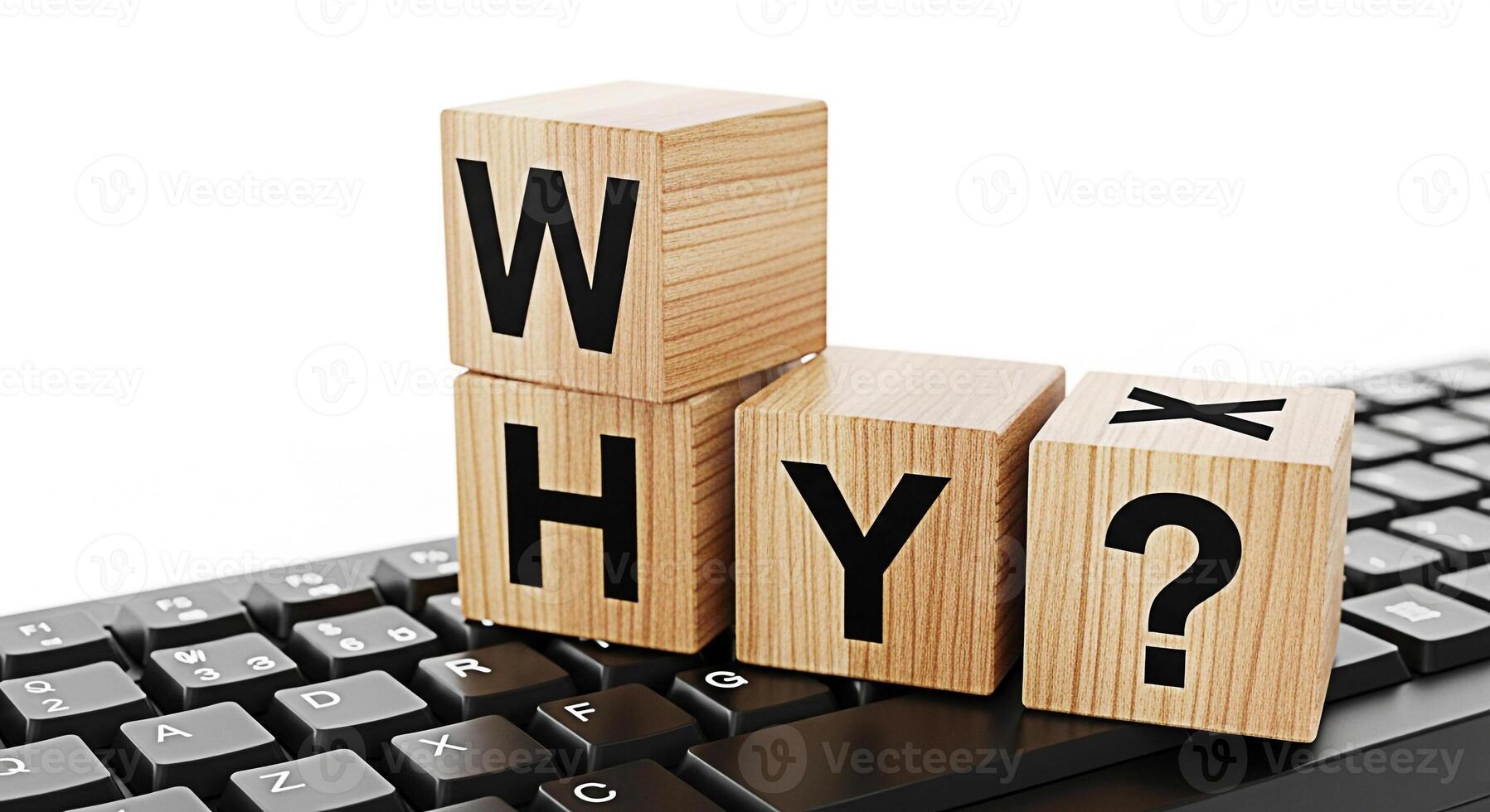 Wooden blocks spelling WHY resting on a black computer keyboard symbolizing inquiry and problemsolving in a digital environment fostering curiosity and critical thinking for business and education Pro Photo