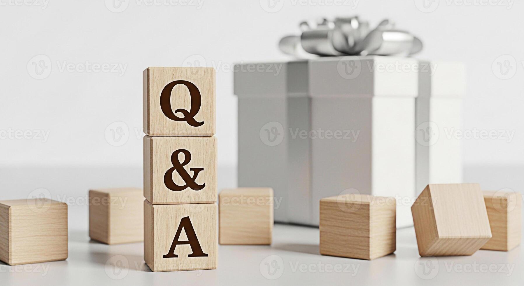 Wooden blocks displaying Q A next to a wrapped gift box on a white surface representing answers support and solutions in a clean and minimalist setting conveying clarity and helpfulness Pro Photo