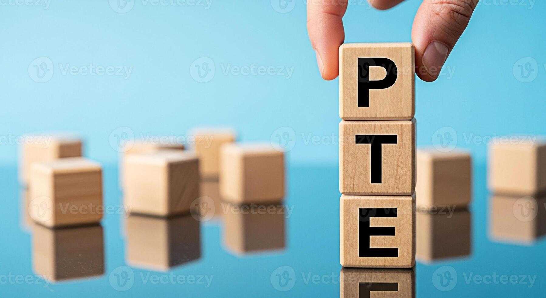 Hand placing a wooden block with the letter P on top of TE blocks against a blue background symbolizing PTE exam preparation educational success and the importance of language proficiency testing Pro Photo