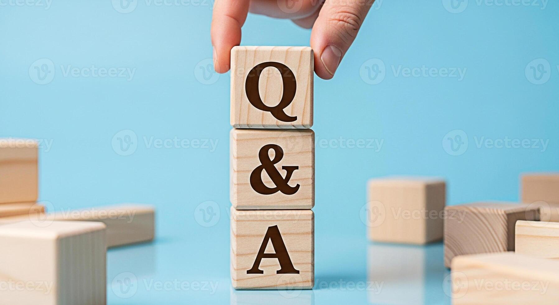 Hand stacking wooden blocks with Q A on a blue surface representing questions and answers knowledge and problemsolving in a simple and clear presentation ideal for educational or business concepts Pro Photo