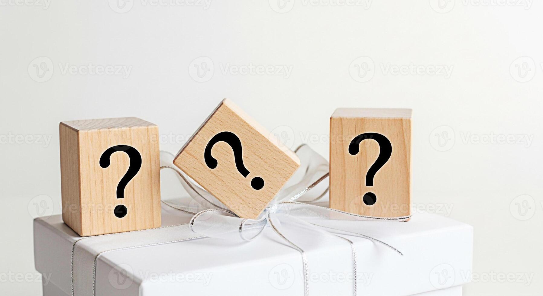 Wooden blocks displaying question marks resting on a white gift box with a silver ribbon in a bright studio setting symbolizing mystery curiosity and the unknown with a minimalist aesthetic Pro Photo