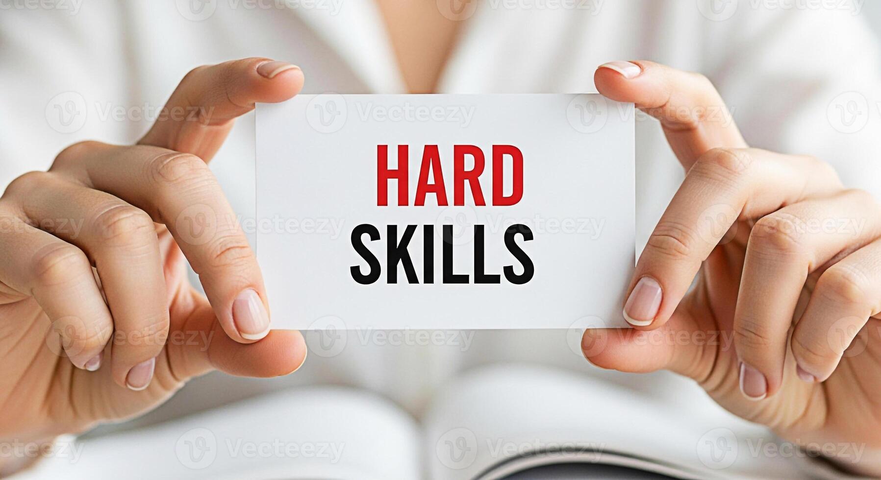 Closeup of hands holding a card with the words HARD SKILLS in red and black emphasizing the importance of technical abilities and expertise in a professional setting conveying a message of competence Pro Photo