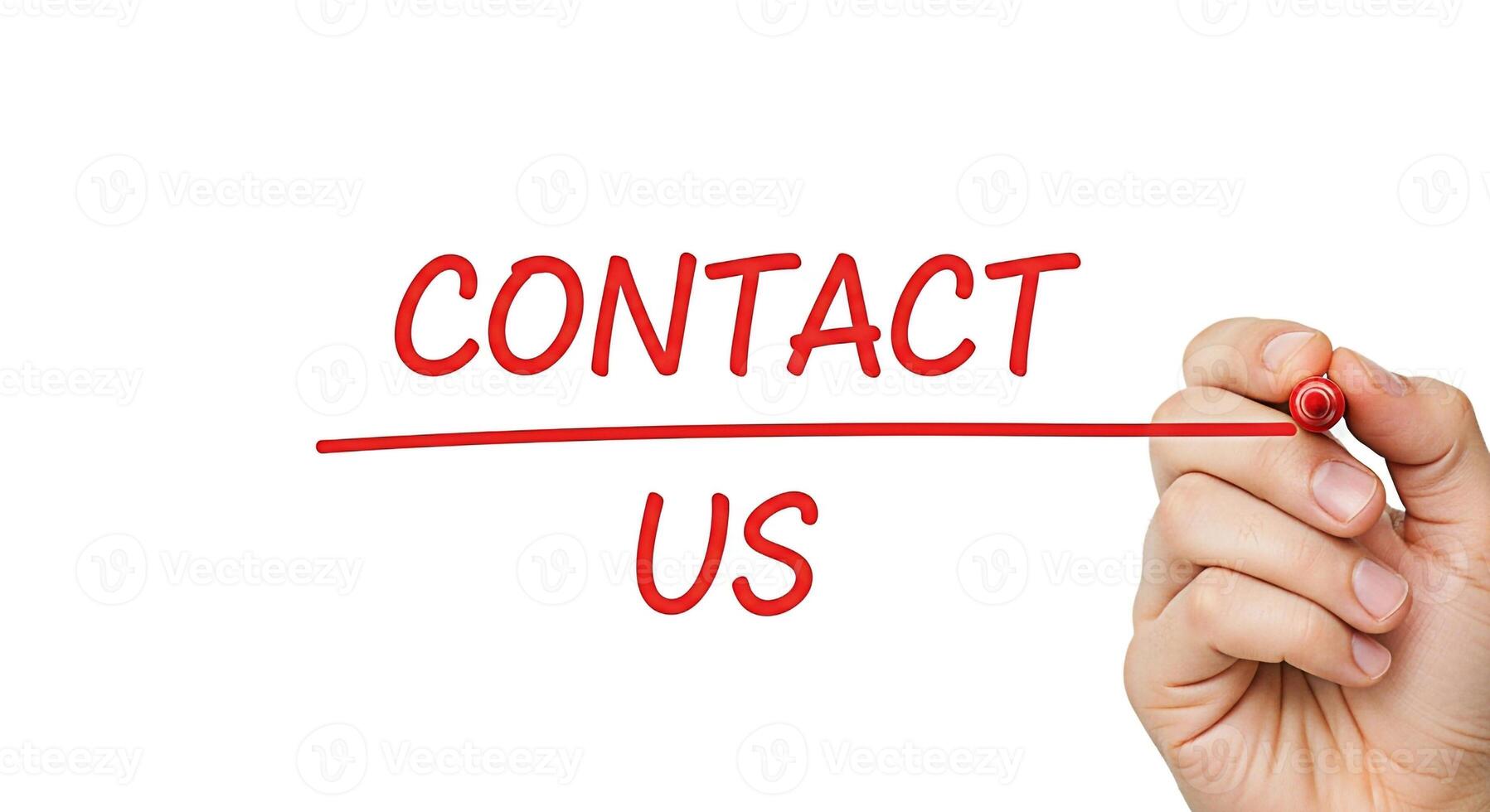 Hand with a red marker writing Contact Us on a white background symbolizing customer service and communication creating a sense of urgency and invitation for interaction Pro Photo