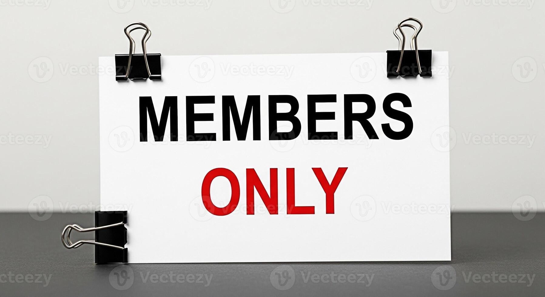 Closeup of a sign displaying Members Only in bold letters held by binder clips on a gray surface creating a sense of exclusivity and restriction in a professional setting Pro Photo