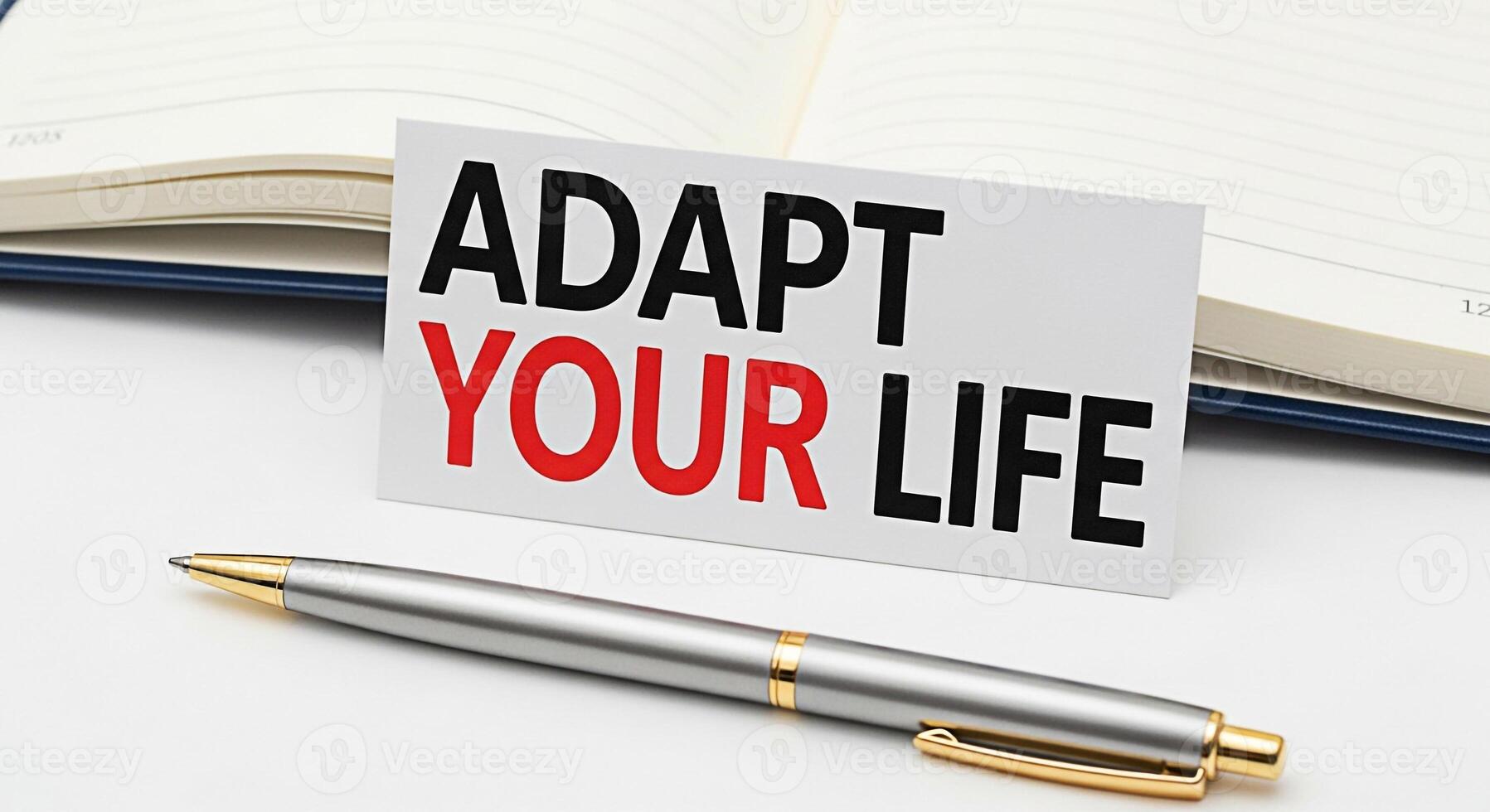 Adapt your life message displayed on a card with a pen and open notebook symbolizing personal growth and resilience in a changing world promoting a positive and proactive mindset for selfimprovement Pro Photo