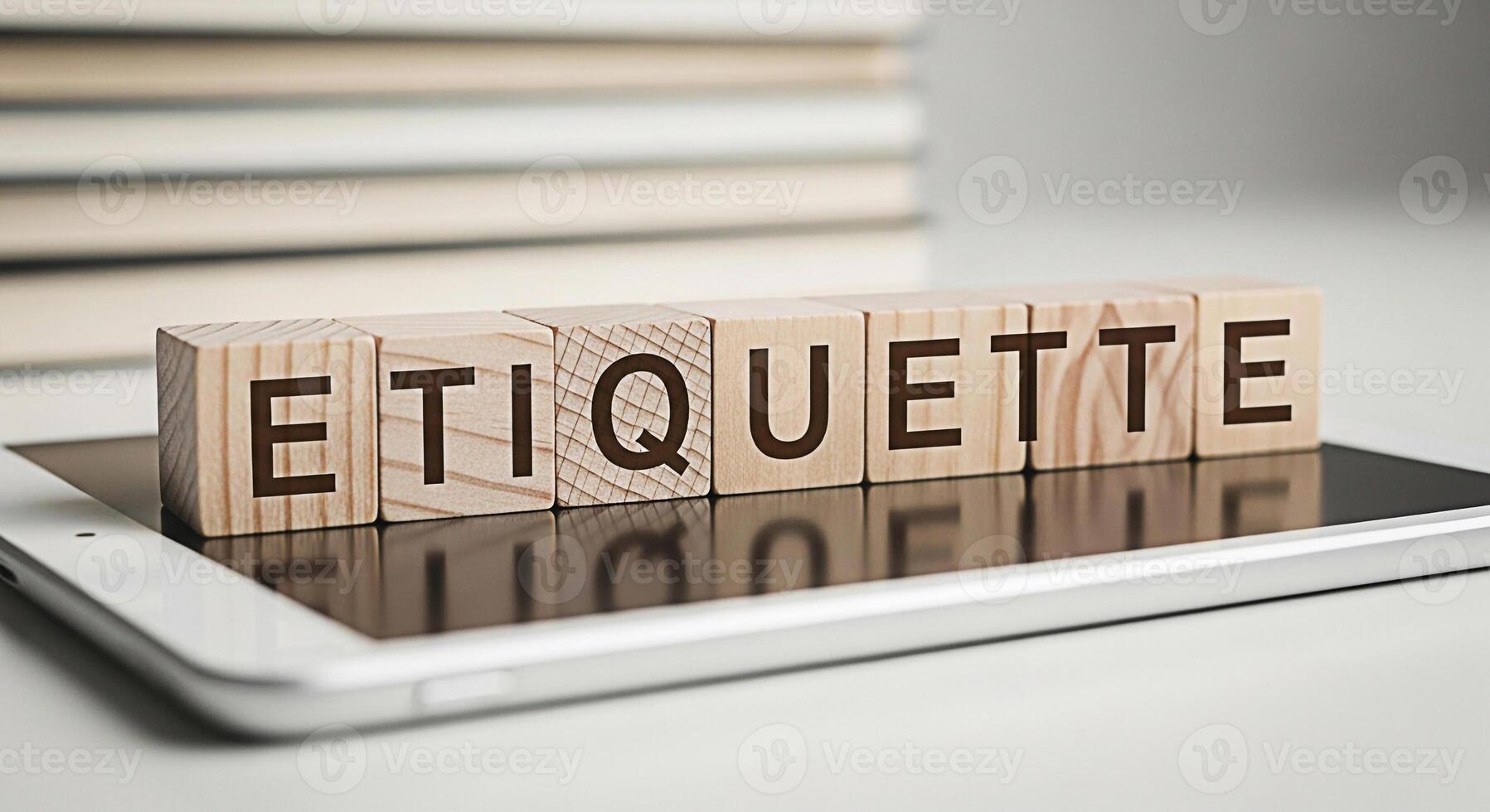 Wooden blocks spelling Etiquette resting on a tablet in a bright studio setting symbolizing professionalism and the importance of good manners in business and social interactions conveying a polished Pro Photo