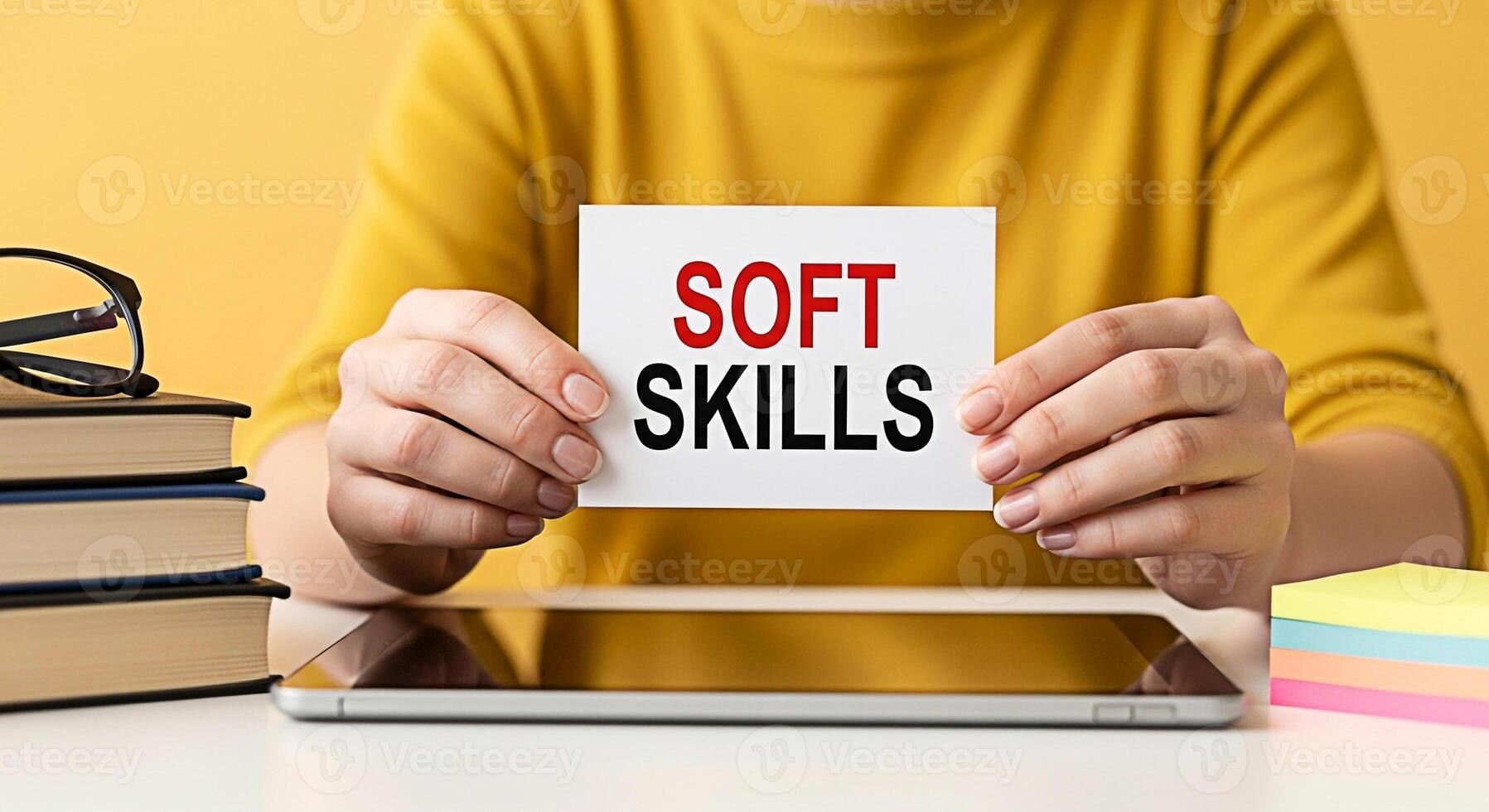 Person holding a card with the words Soft Skills in a bright yellow studio setting emphasizing the importance of interpersonal skills for professional development and career success creating a positiv Pro Photo