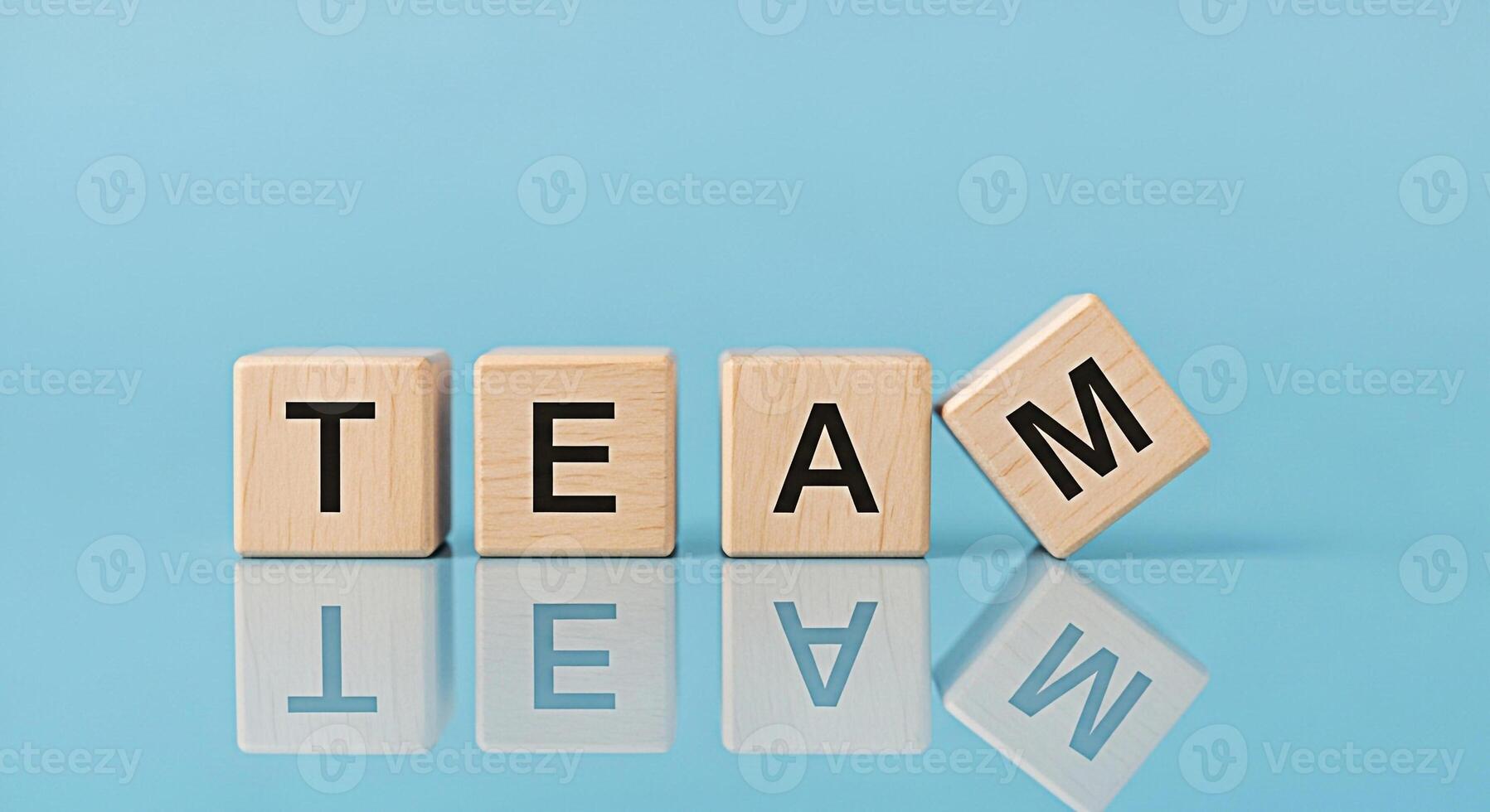 Wooden blocks spelling TEAM on a reflective blue surface symbolizing collaboration and teamwork fostering a positive and supportive environment for achieving common goals and building strong relations Pro Photo