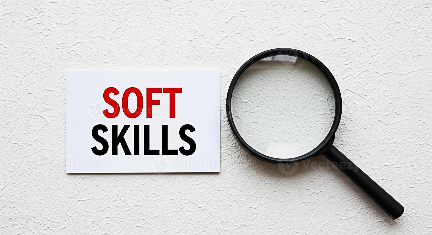 Magnifying glass examining a card with the words Soft Skills on a textured white background emphasizing the importance of developing interpersonal and communication skills for career success Pro Photo