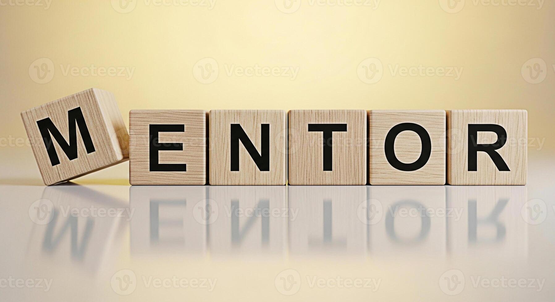 Wooden blocks spelling out MENTOR on a reflective surface against a soft yellow backdrop symbolizing guidance support and the importance of mentorship in professional and personal development creating Pro Photo