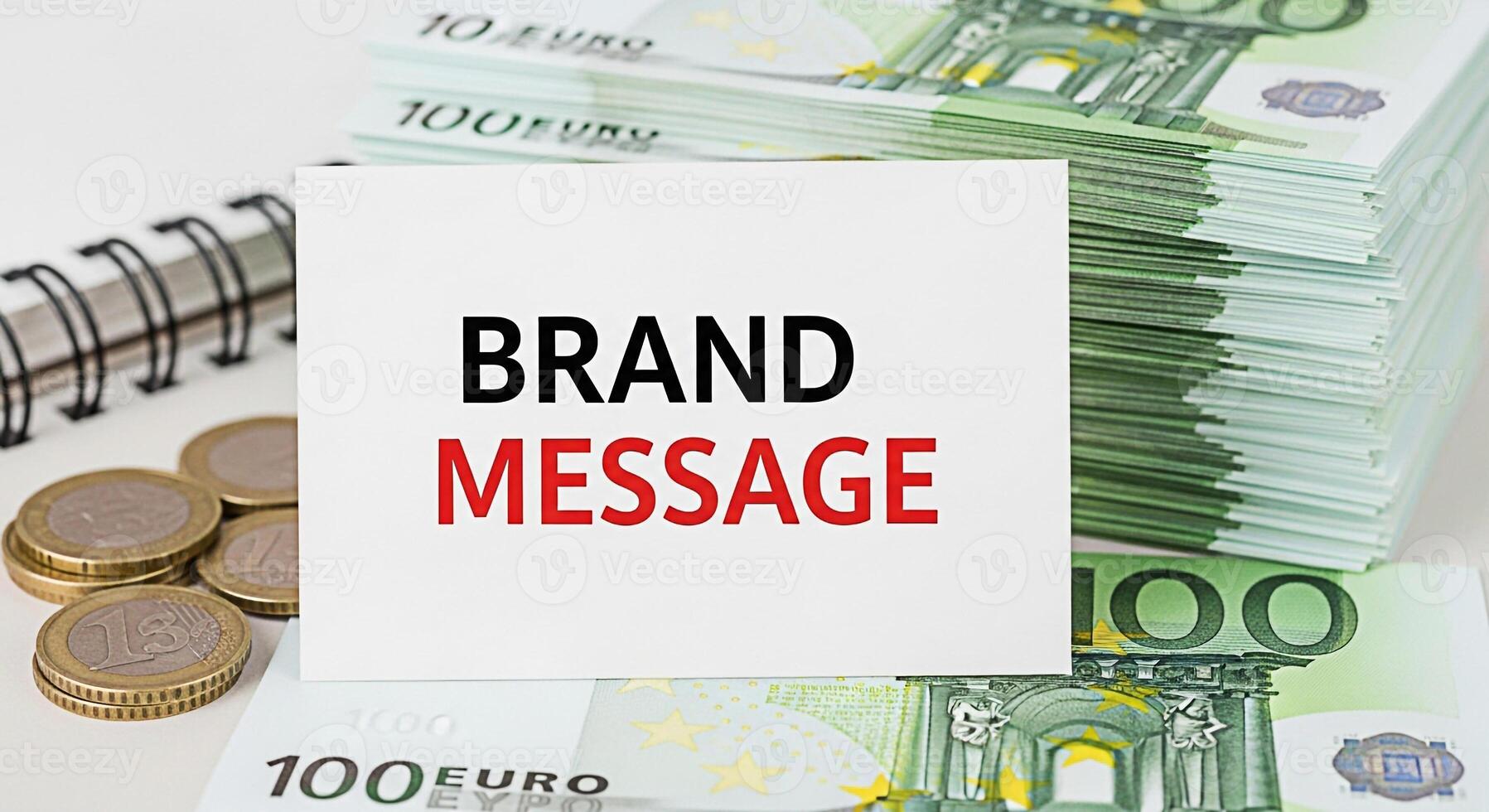 Closeup of a business card displaying a brand message strategically placed on a stack of 100 Euro banknotes and coins in a welllit studio setting symbolizing financial communication and strategic mark Pro Photo