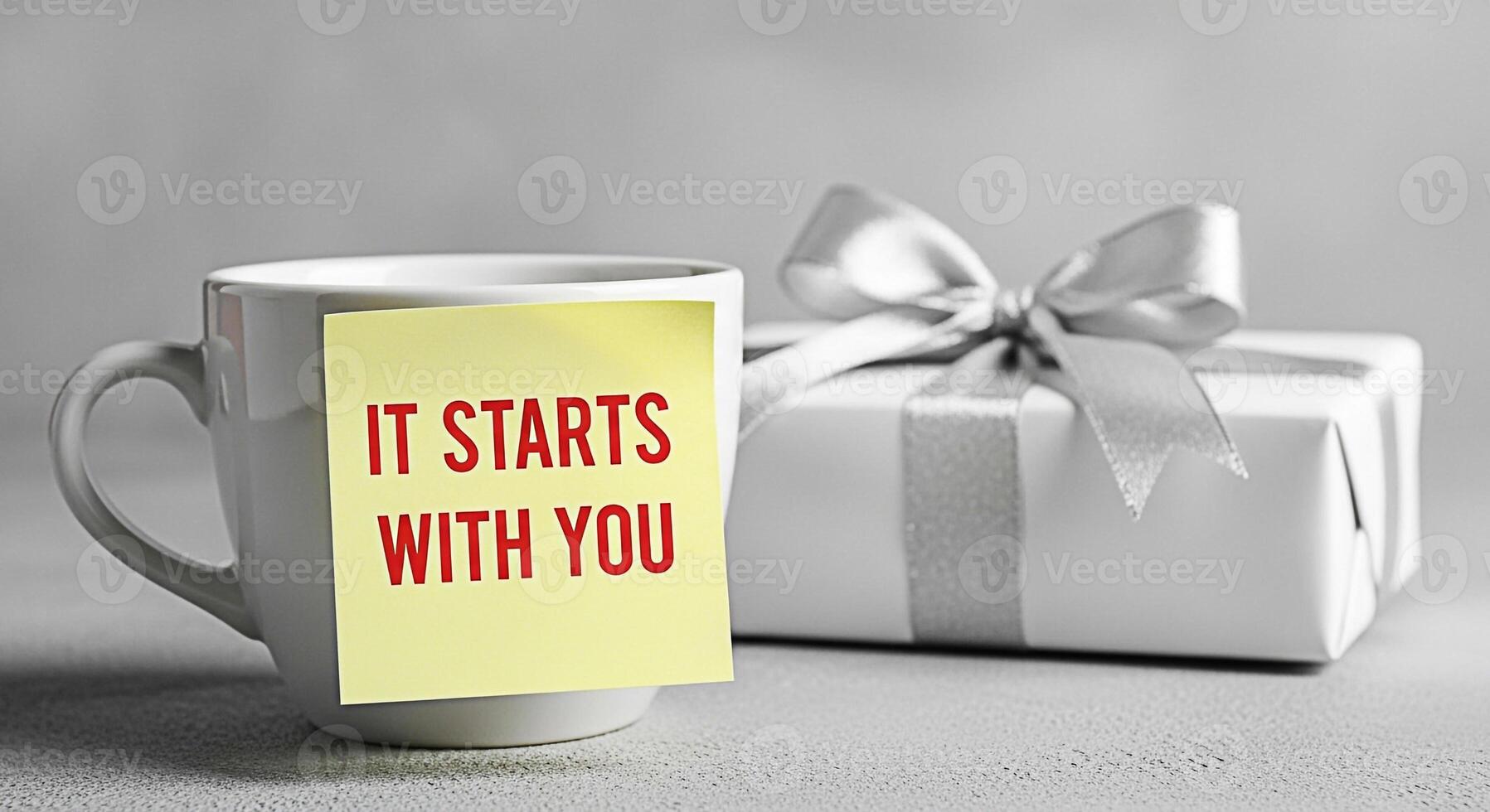 White mug displaying a motivational sticky note with the message It starts with you next to a wrapped gift with a silver bow on a gray surface conveying a message of selfimprovement and personal growt Pro Photo