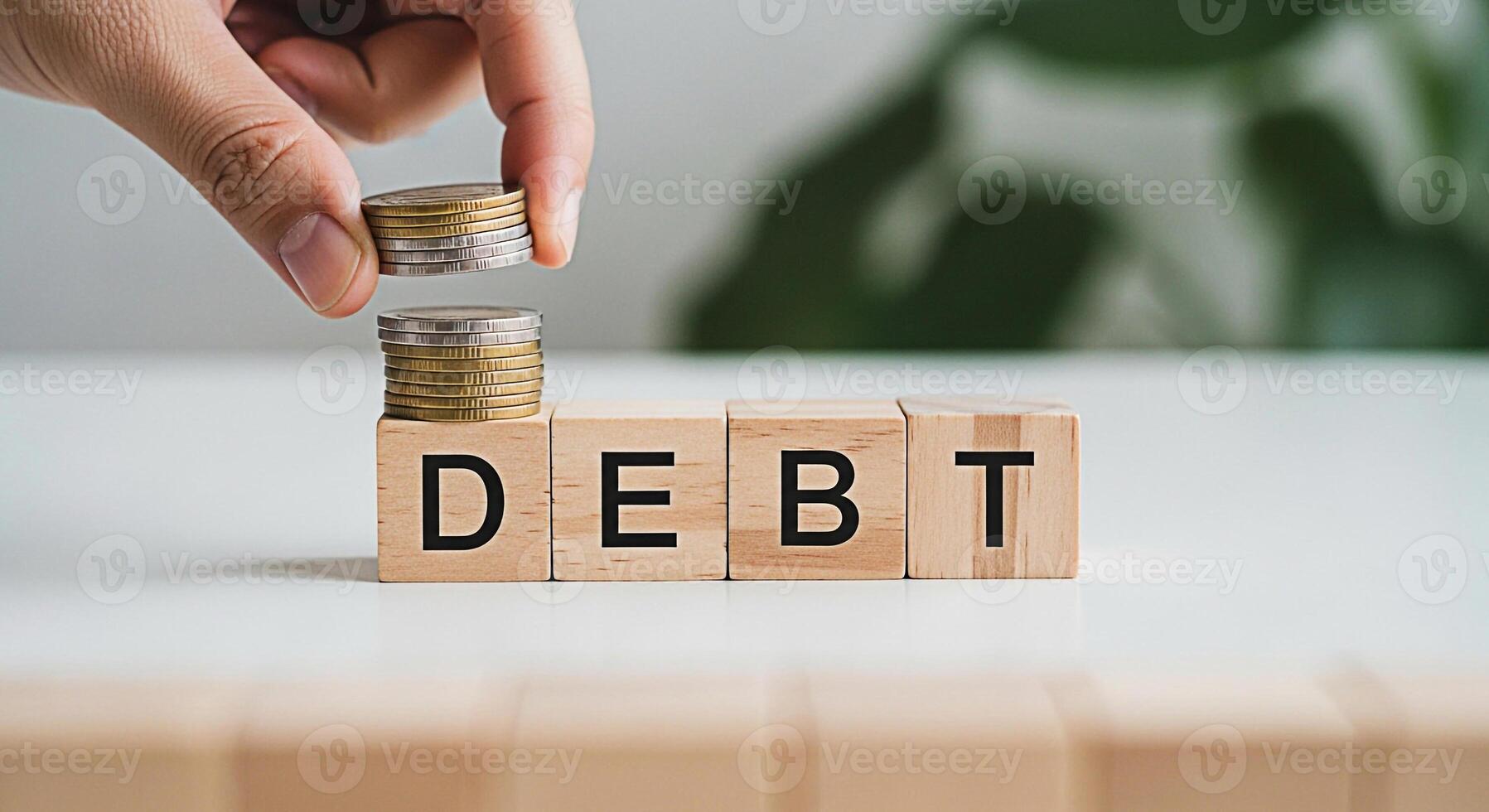 Hand stacking coins on wooden blocks spelling DEBT on a white table symbolizing financial burden and the challenge of managing debt with savings and investment in a modern minimalist setting Pro Photo