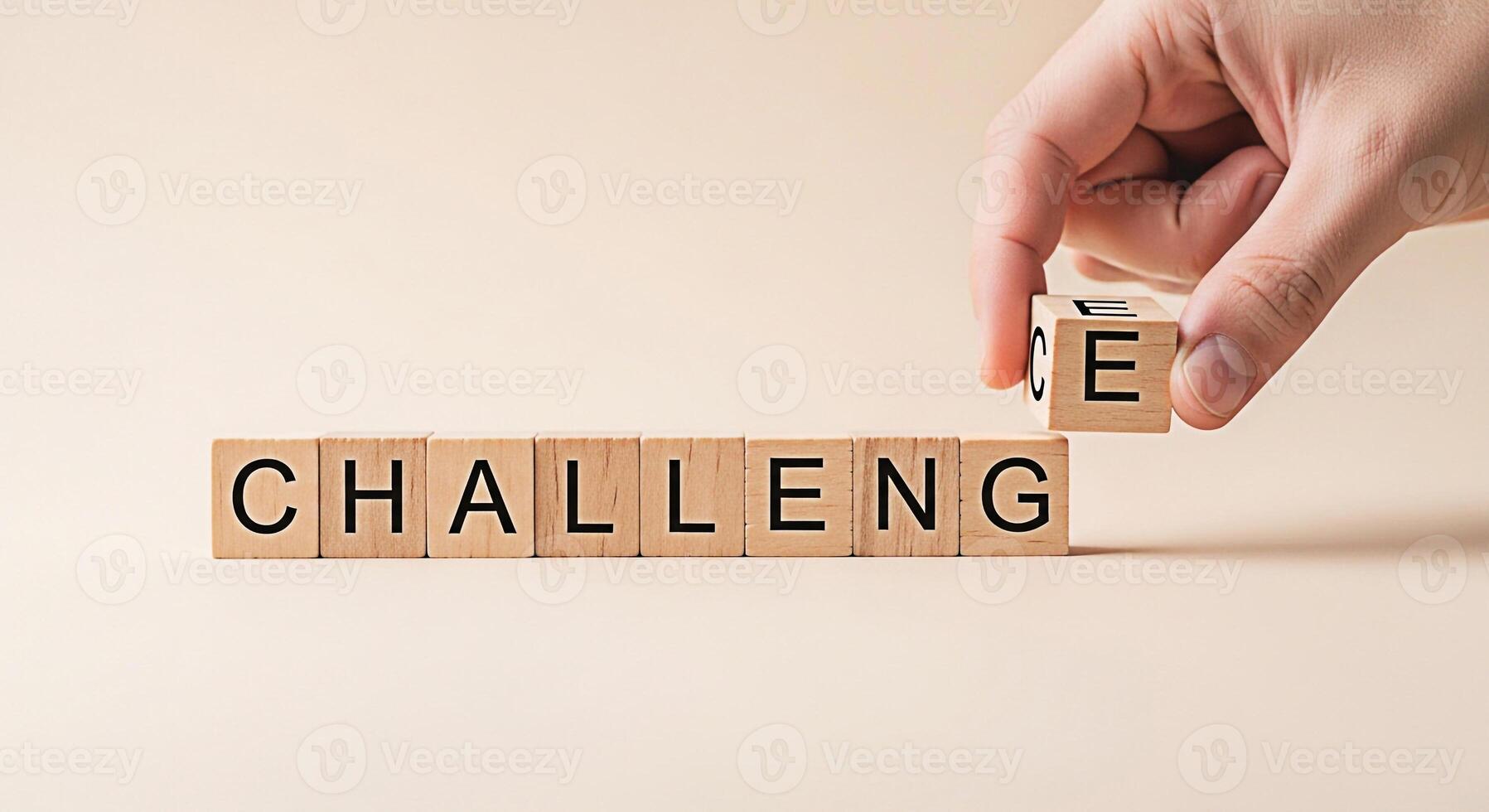 Hand completing Challenge with Change wooden blocks on a neutral background symbolizing overcoming obstacles and embracing transformation with a positive and motivational mindset for personal growth Pro Photo