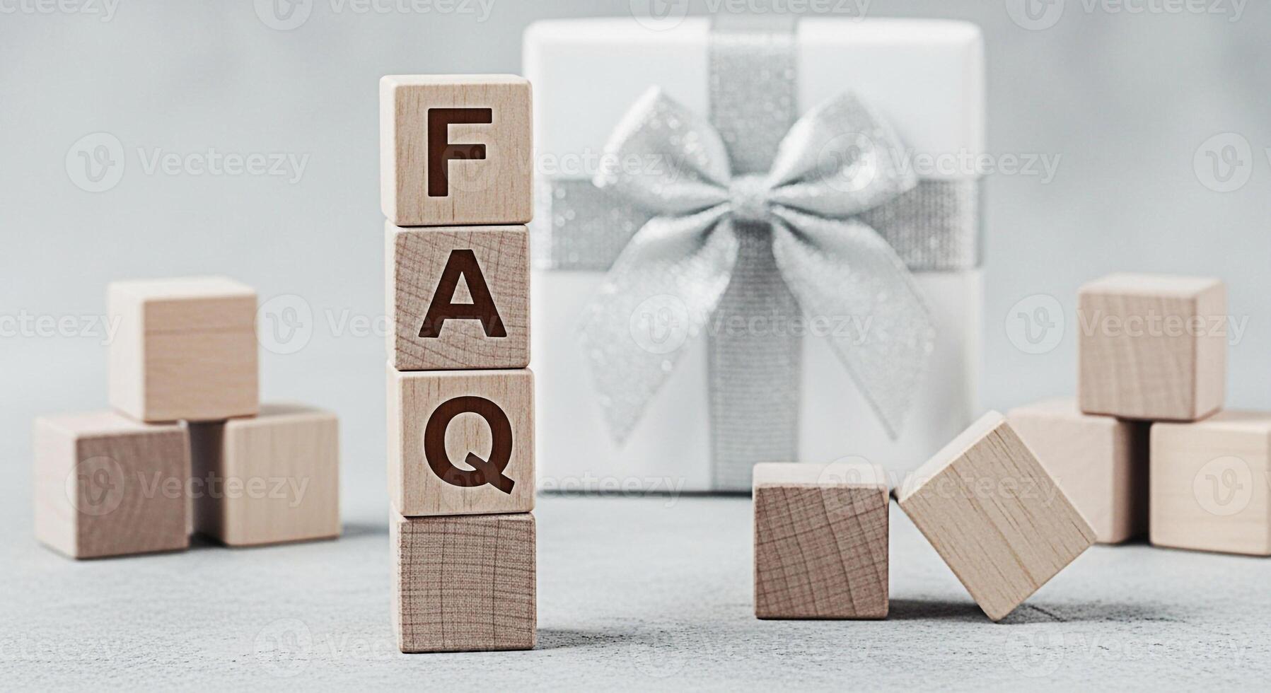 Wooden blocks spelling FAQ displayed near a gift box with a silver ribbon creating a sense of clarity and helpfulness in a bright clean setting ideal for customer service or informational content Pro Photo