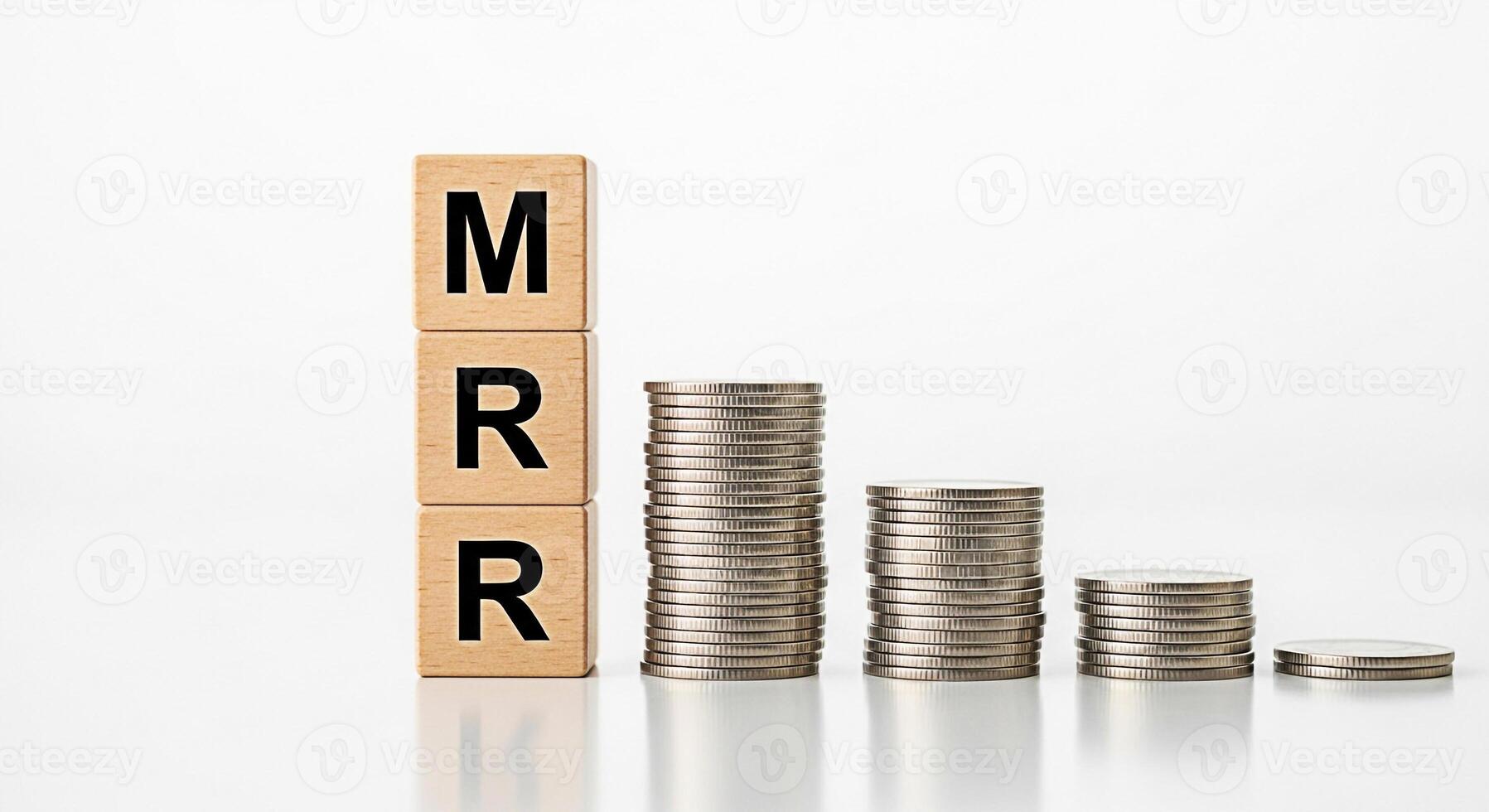 Wooden blocks displaying MRR next to descending stacks of coins on a white surface representing decreasing monthly recurring revenue and financial loss in a minimalist clean setting Pro Photo