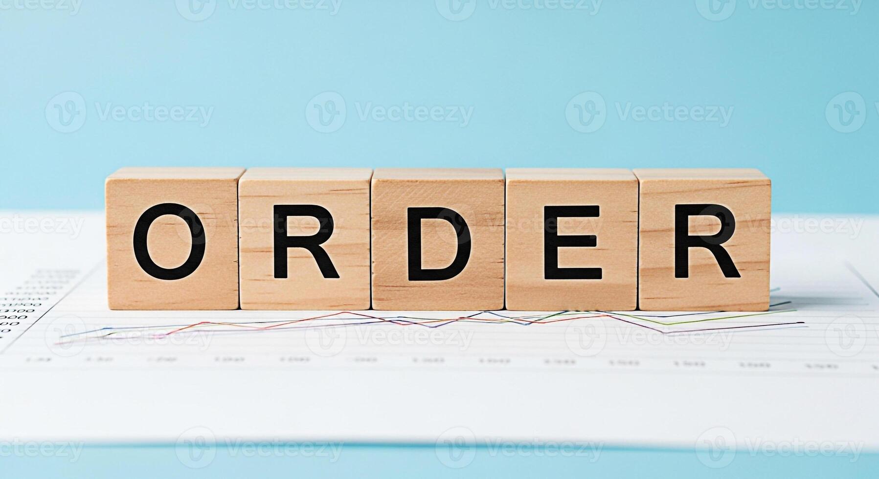 Wooden blocks spelling ORDER resting on a financial chart in a bright clean studio setting symbolizing organization structure and systematic approach to business and financial planning for success Pro Photo