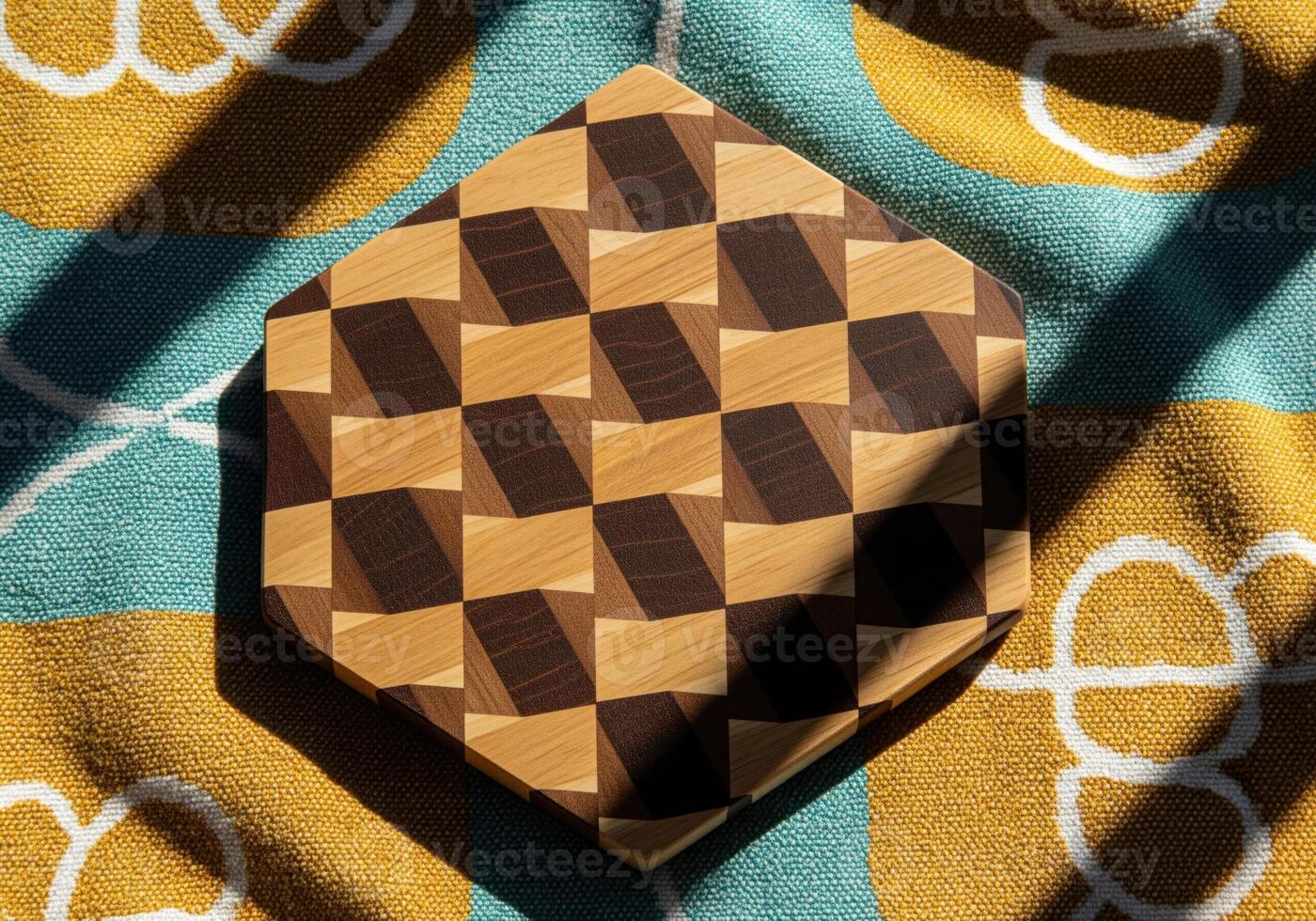Modern hexagonal wooden serving board with 3D geometric inlay pattern and strong shadows. Pro Photo