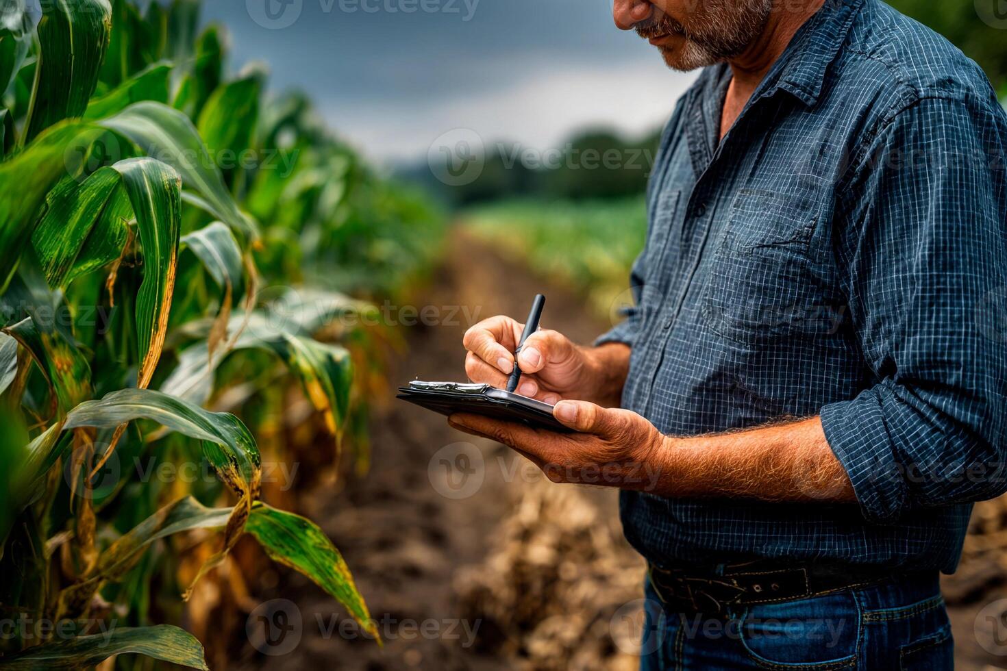 A farmer is closely examining a cornfield while taking notes on a clipboard. The overcast sky hints at possible rain, suggesting a need for careful monitoring of the crops Pro Photo