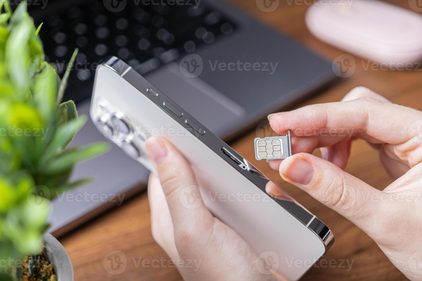 Person's hand holds a sleek smartphone, preparing to insert a nano SIM card, representing essential mobile network setup and modern telecommunications technology Pro Photo