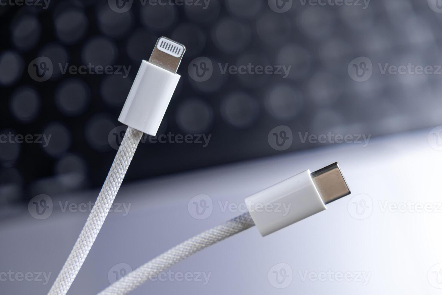 Modern white braided cables displaying Lightning and USB-C connectors, highlighting universal connectivity and compatibility for rapid device charging and efficient data transfer Pro Photo