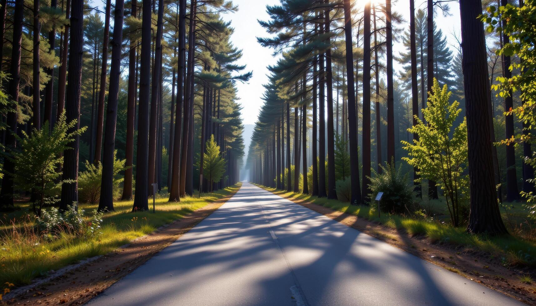 The paved road cuts through a forest of towering trees, with shadows stretching across the asphalt in the afternoon light. Free Photo