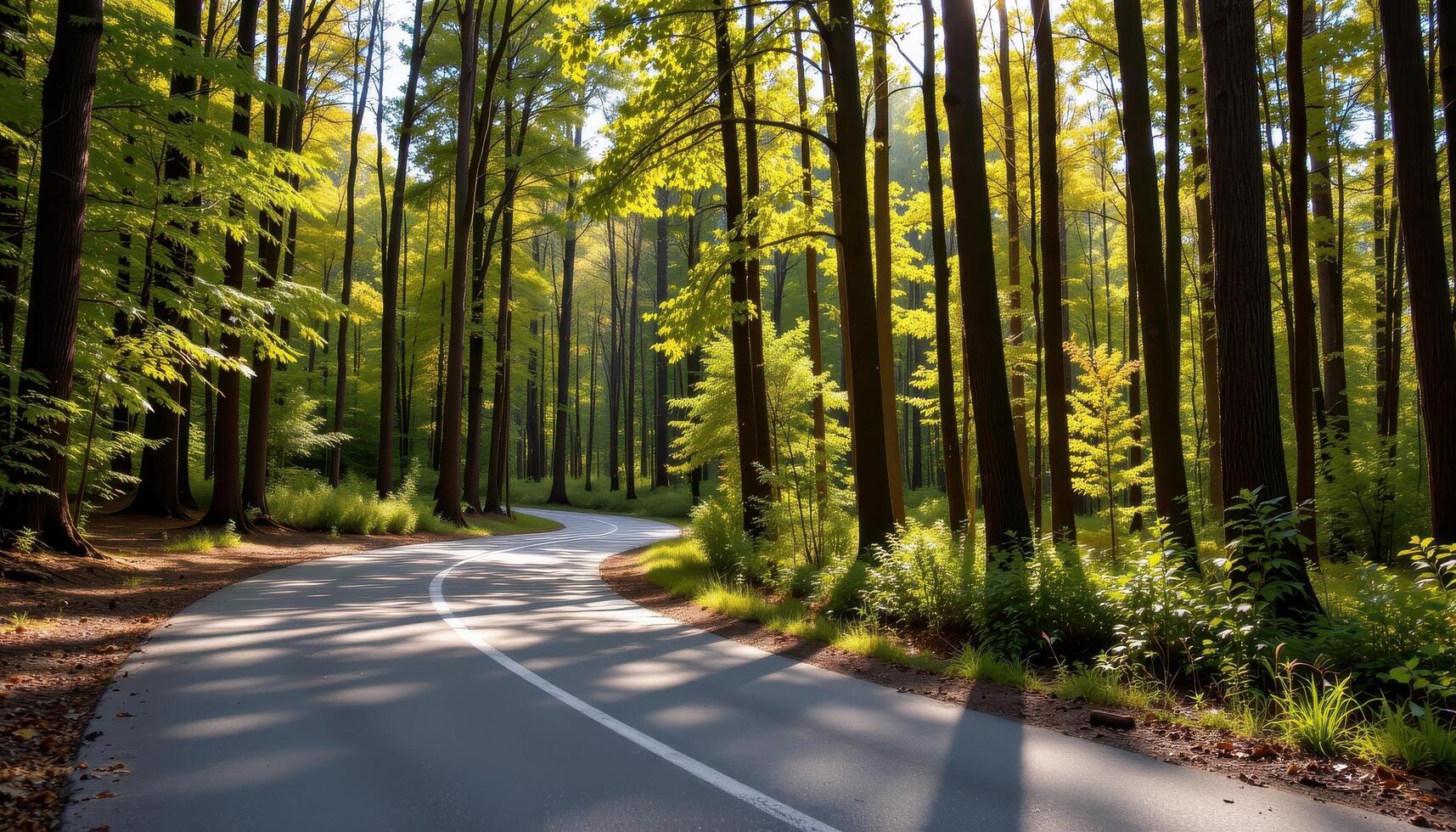 The paved road winds through a forest of tall trees, with soft sunlight casting long shadows across the smooth surface of the road. photo
