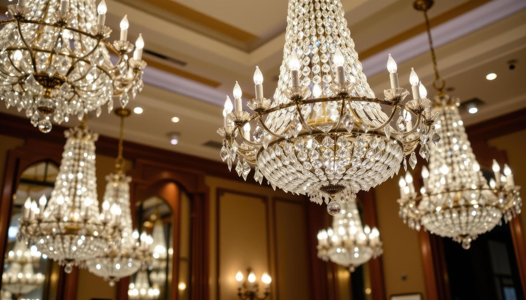 Multiple crystal chandeliers illuminate the room with overlapping layers of brilliance, creating a dreamlike atmosphere. photo