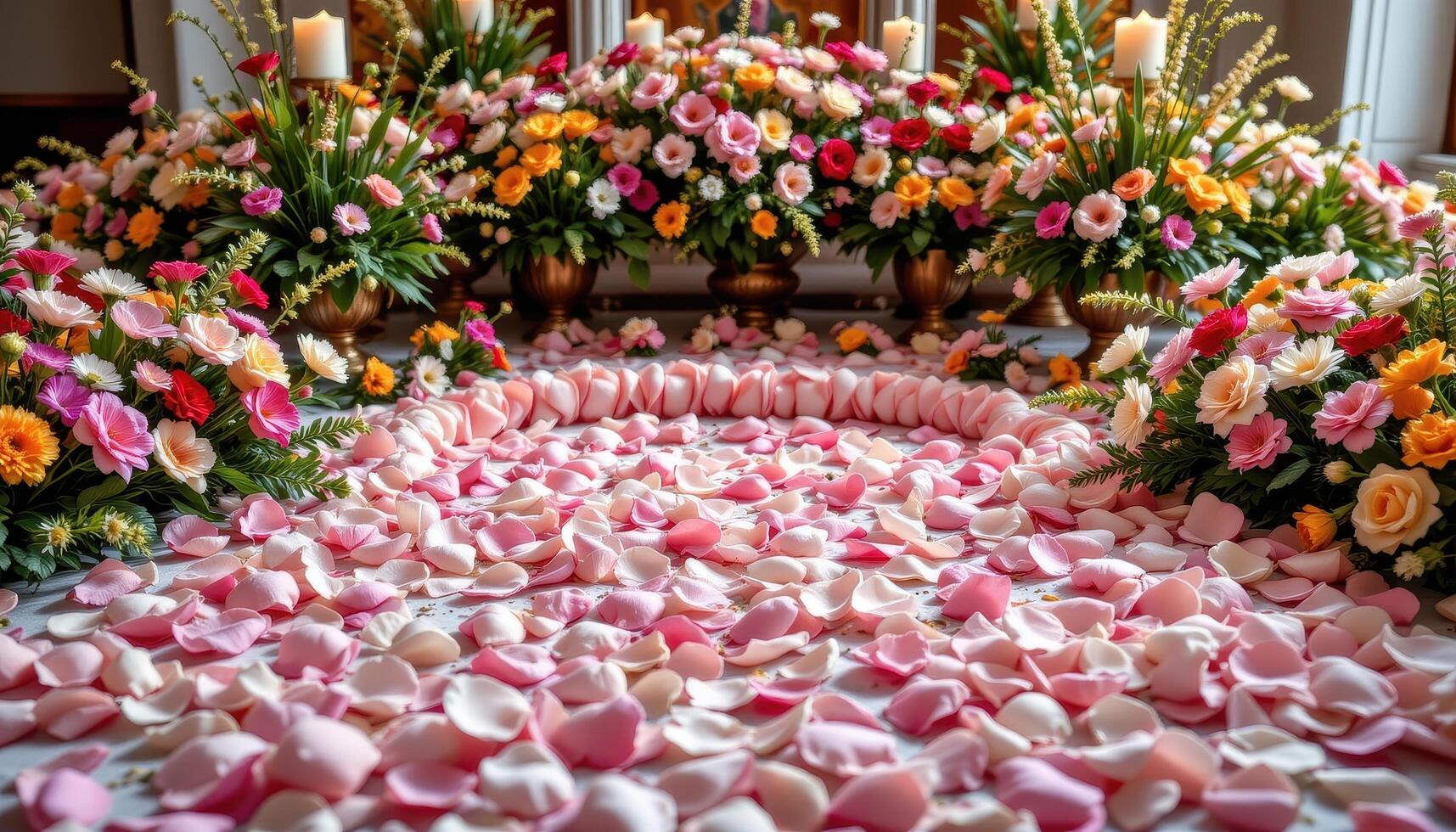 Fresh blooms enveloping the altar, petals forming intricate patterns to create a harmonious, visually stunning, and sacred display, no people, no animals. Free Photo