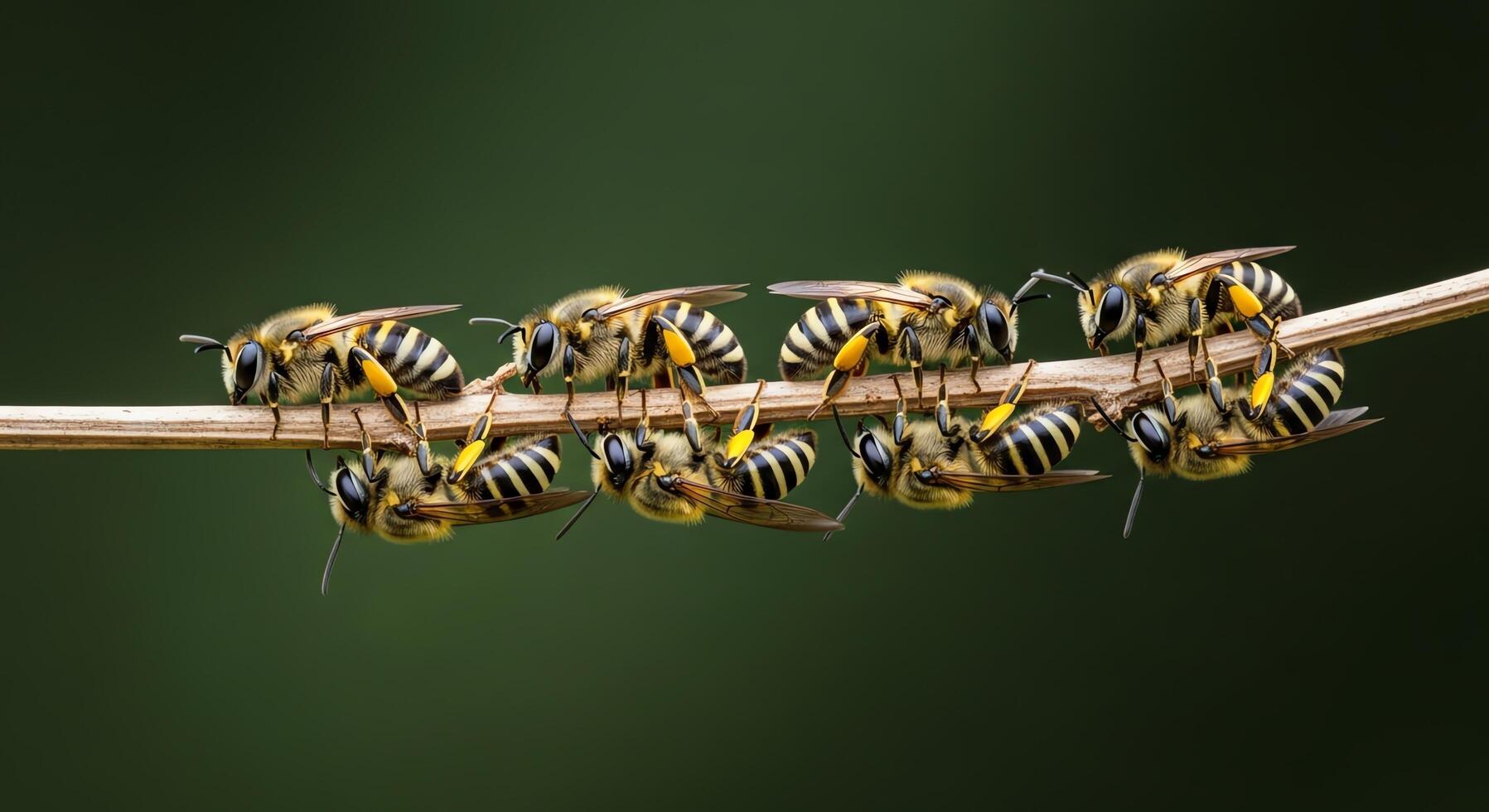 A close-up macro photograph of a row of honeybees hanging from a thin branch with a blurred green background Free Photo