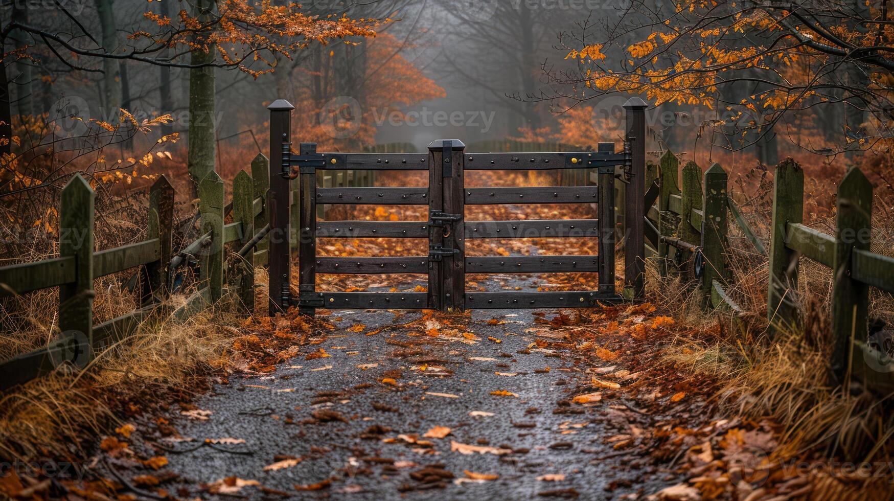 Rustic Autumn Gate and Fence on Leaf-Covered Path in Misty Forest, trees Pro Photo