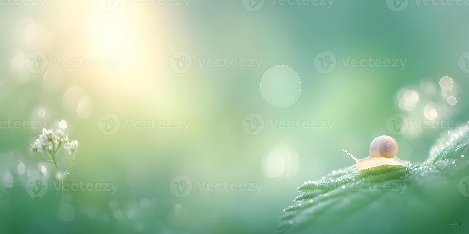 A tiny snail with a light shell slowly crawls across a dew covered green leaf against a soft sunlit bokeh background Pro Photo