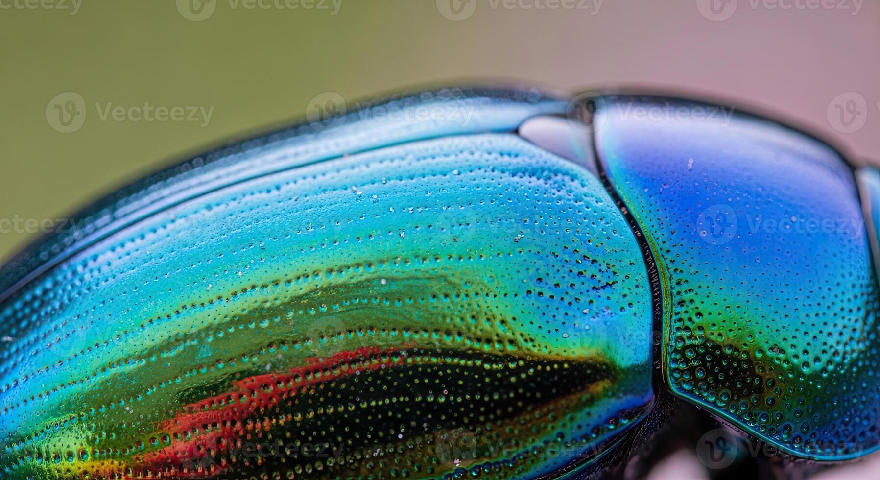 Close-up of a vibrant iridescent beetle shell showing intricate textures and colors. Pro Photo