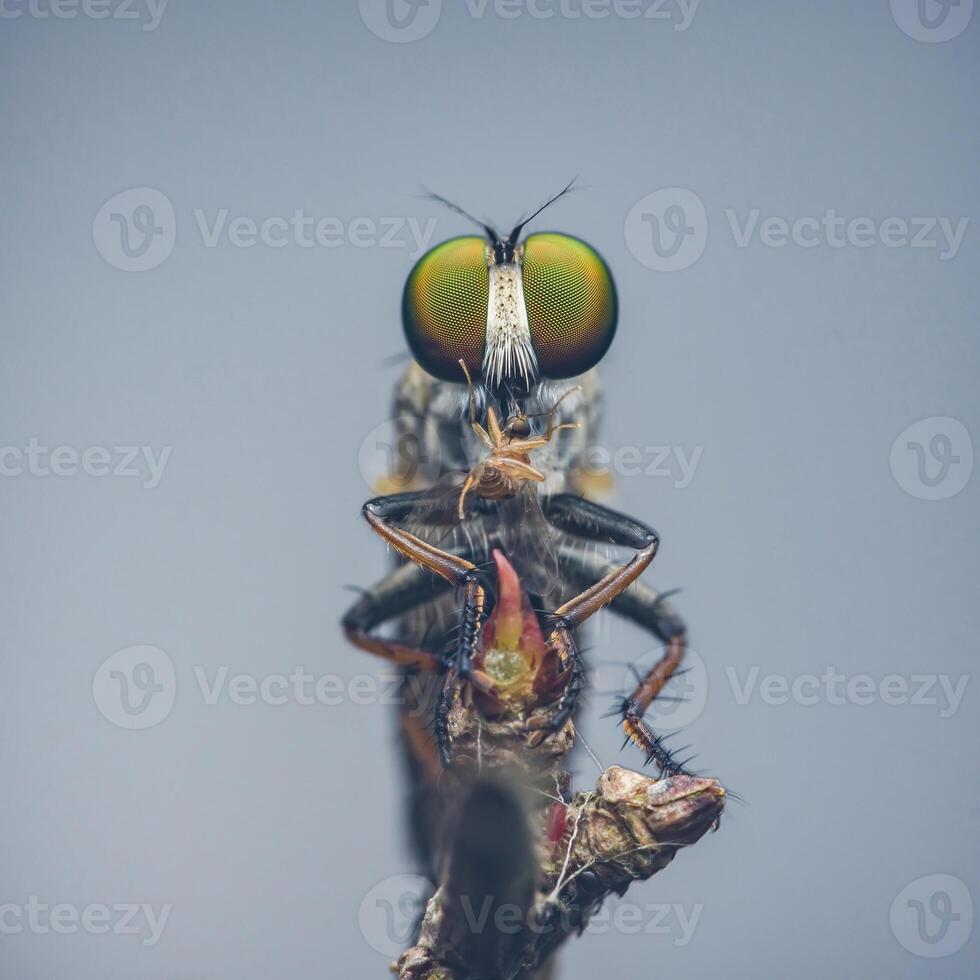 Macro shot of a robber fly with large eyes and prey on a branch Pro Photo