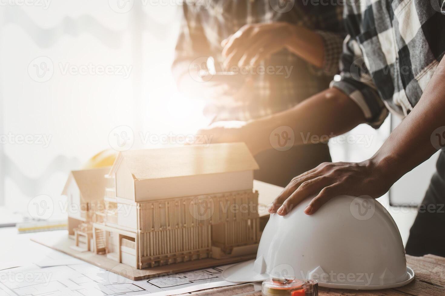 Architecture team drawing something while working with blueprint in the office. Architecture and Engineer concept Pro Photo