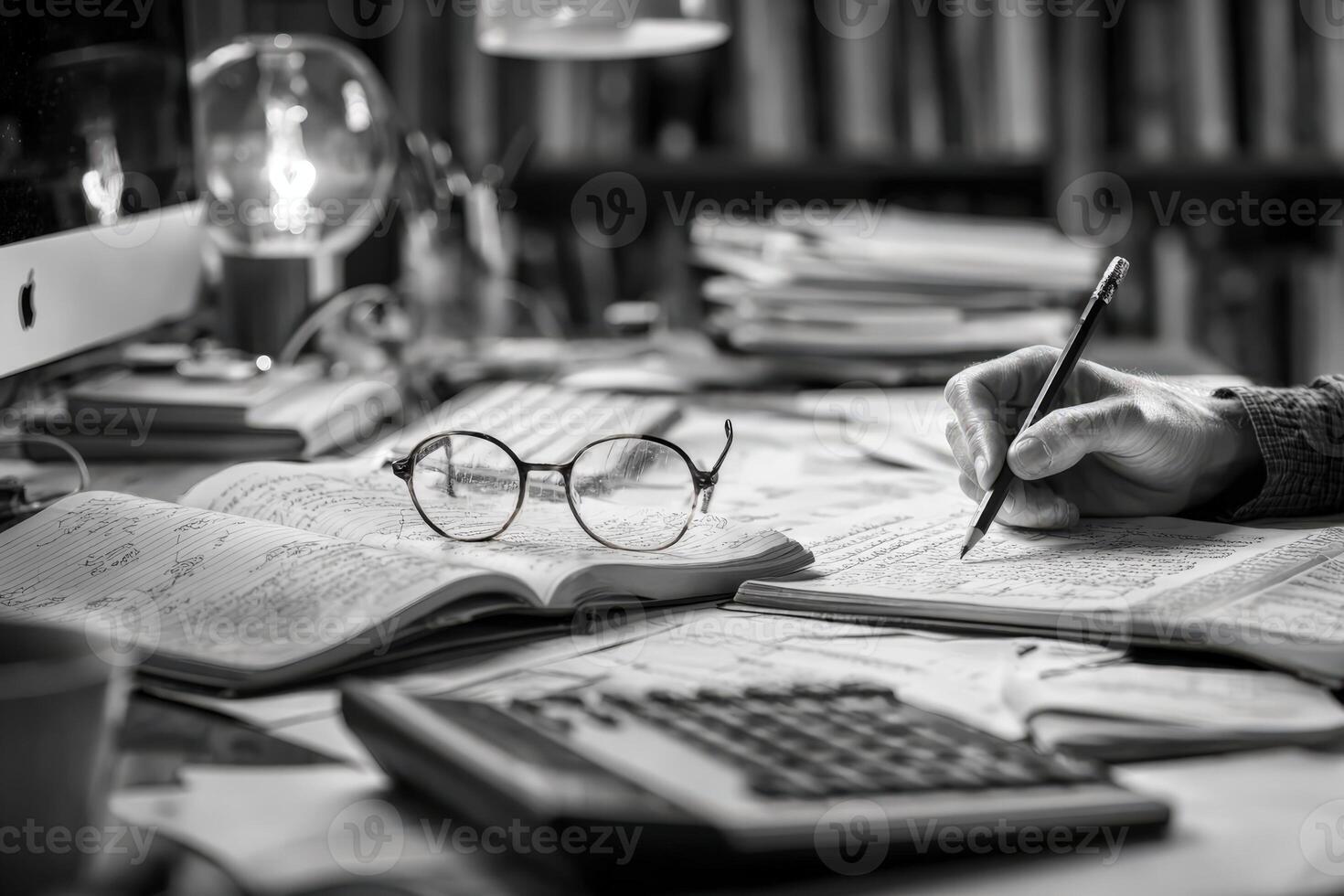 Black and white image of a focused individual writing notes with a pencil, surrounded by books, glasses, and a calculator on a cluttered desk, illustrating a studious atmosphere Pro Photo