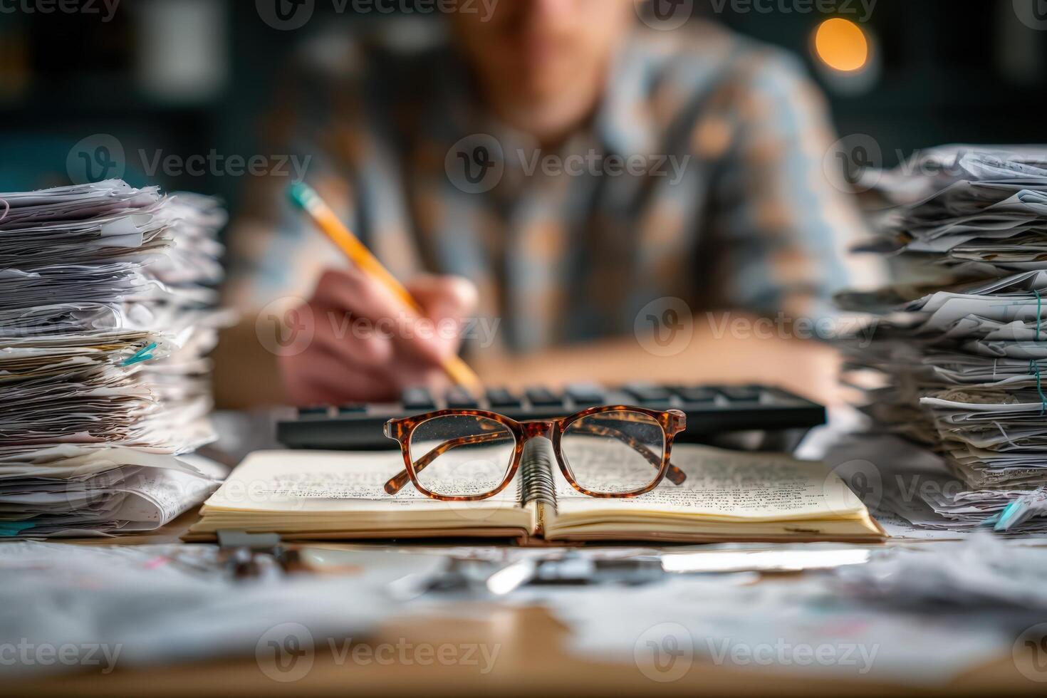 Focused individual wearing glasses is calculating expenses with a calculator surrounded by stacks of paperwork and an open notebook, illustrating financial organization and diligence Pro Photo