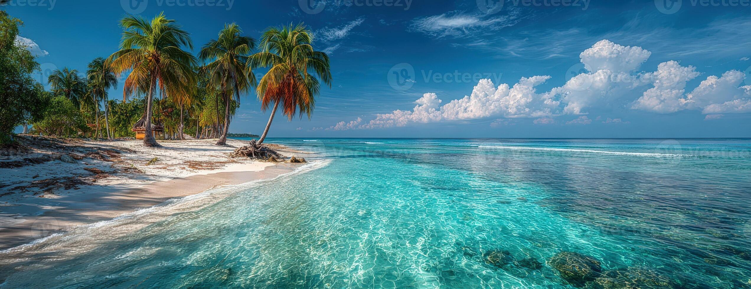 Tropical beach scene featuring palm trees swaying gently in the breeze, clear turquoise waters lapping at the shore, and fluffy clouds scattered across a bright blue sky Pro Photo