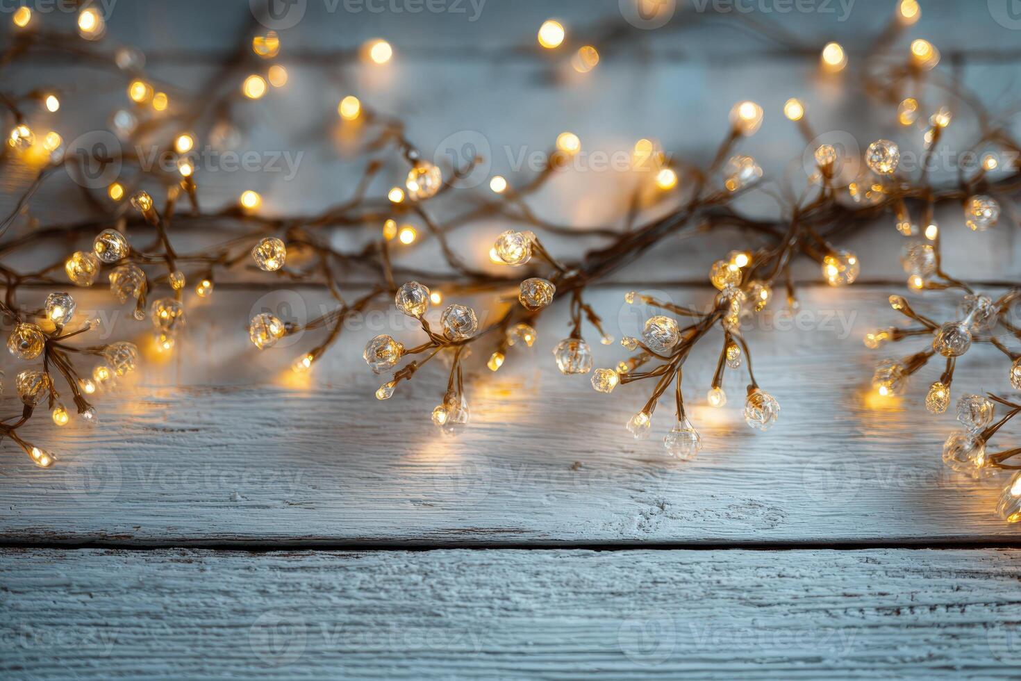Decorative string lights with warm glowing bulbs are elegantly arranged on a rustic wooden surface, creating a cozy and inviting atmosphere for festive occasions Pro Photo
