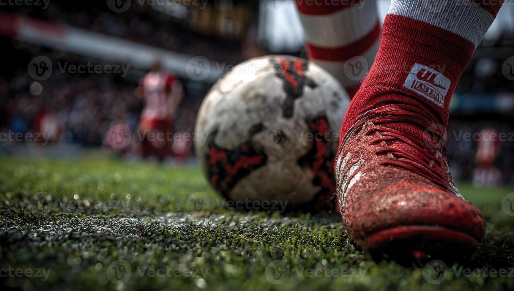 Close-up of a soccer player's foot in red cleats poised to kick a weathered ball on a vibrant green field, capturing the intensity of the game and athleticism in action Pro Photo