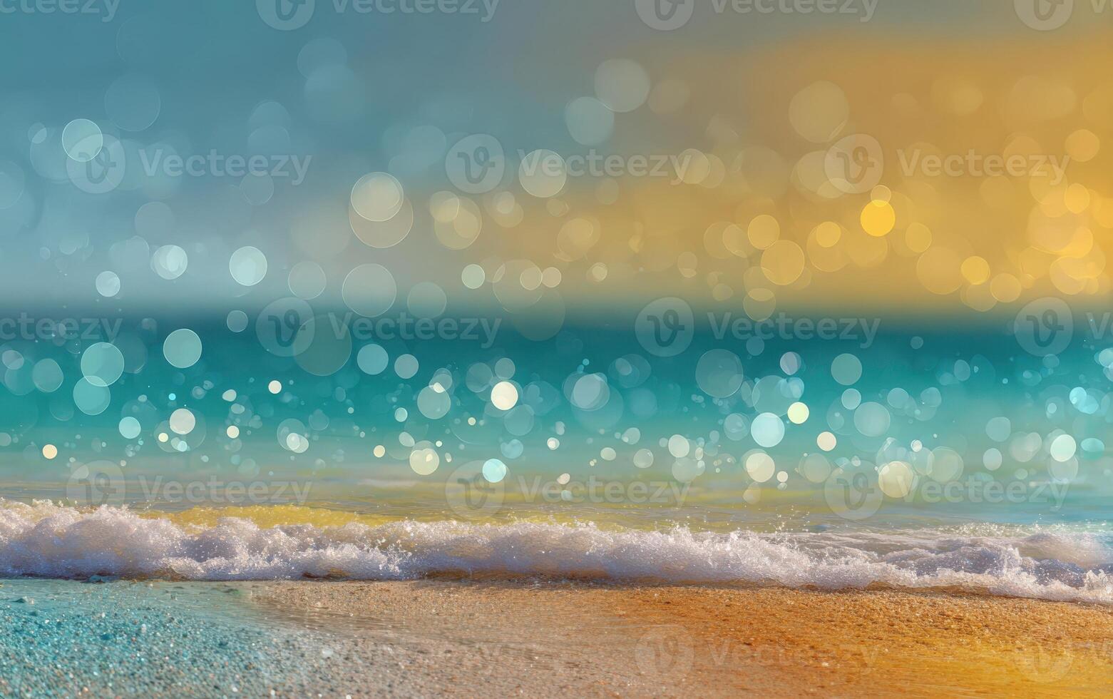 Vibrant beach scene with soft waves lapping at golden sand, sparkling bokeh effects in the background, creating a serene and tranquil atmosphere for relaxation and escape Pro Photo