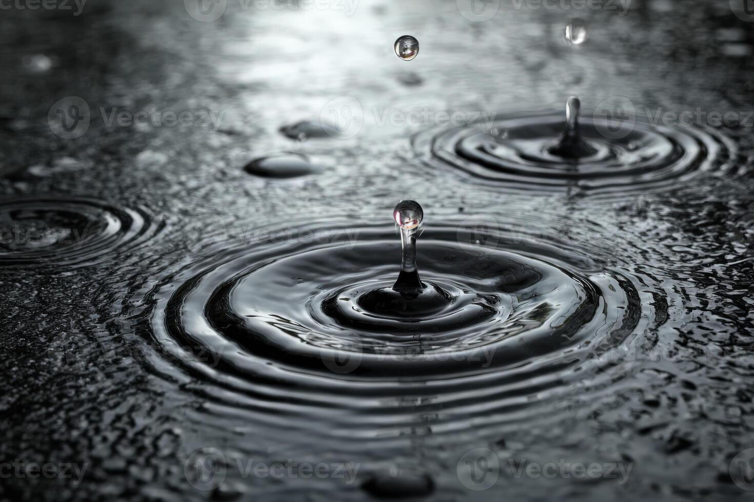 Close-up of water droplets creating ripples on a dark surface, showcasing the beauty of nature's elements and the intricate patterns formed by falling rain Pro Photo