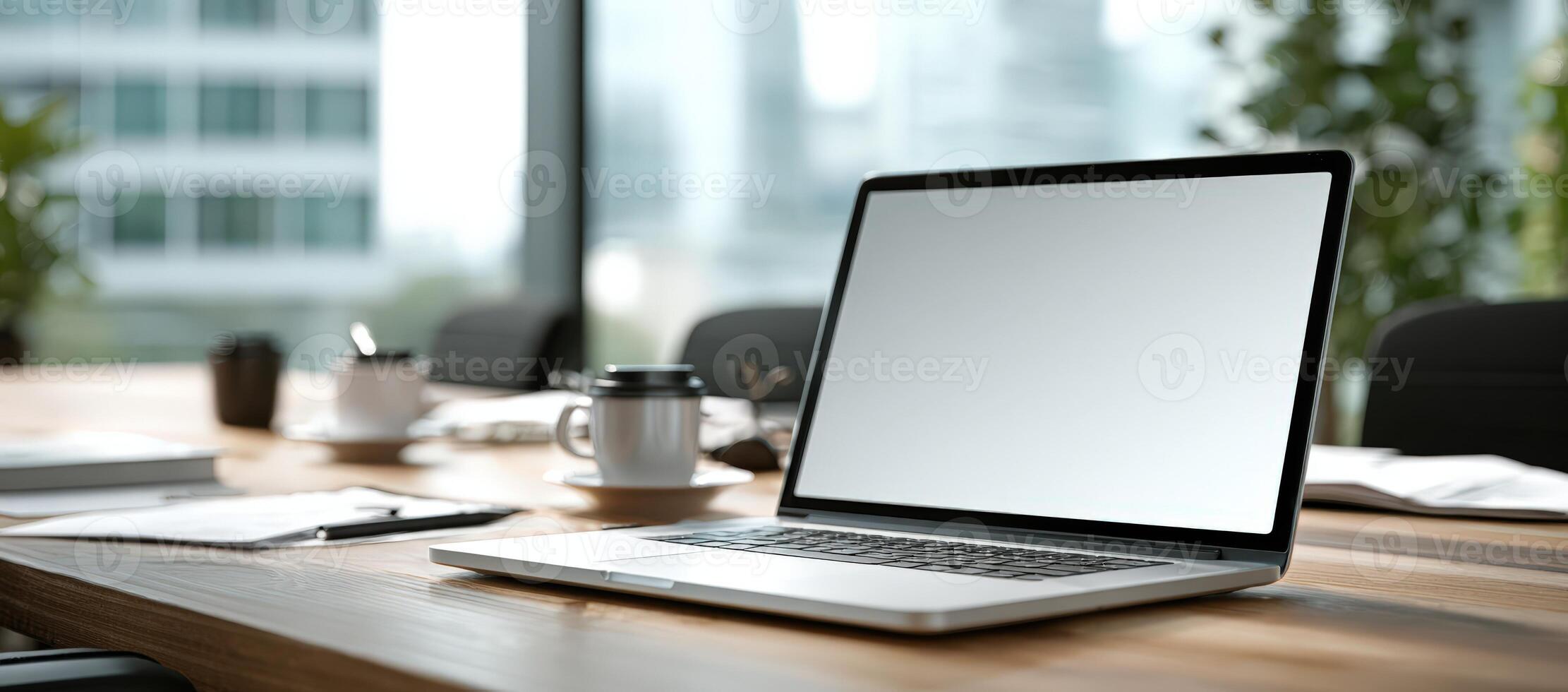 Laptop mock up with blank screen on wooden table in modern office setting, surrounded by coffee cup and stationery, ideal for design presentations and digital projects Pro Photo