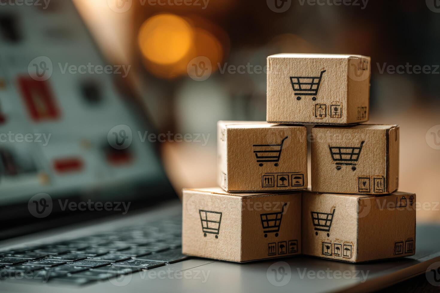 Stacked cardboard boxes with shopping cart icons are placed on a laptop keyboard, symbolizing online shopping, e-commerce, and digital retail experiences in a modern workspace Pro Photo