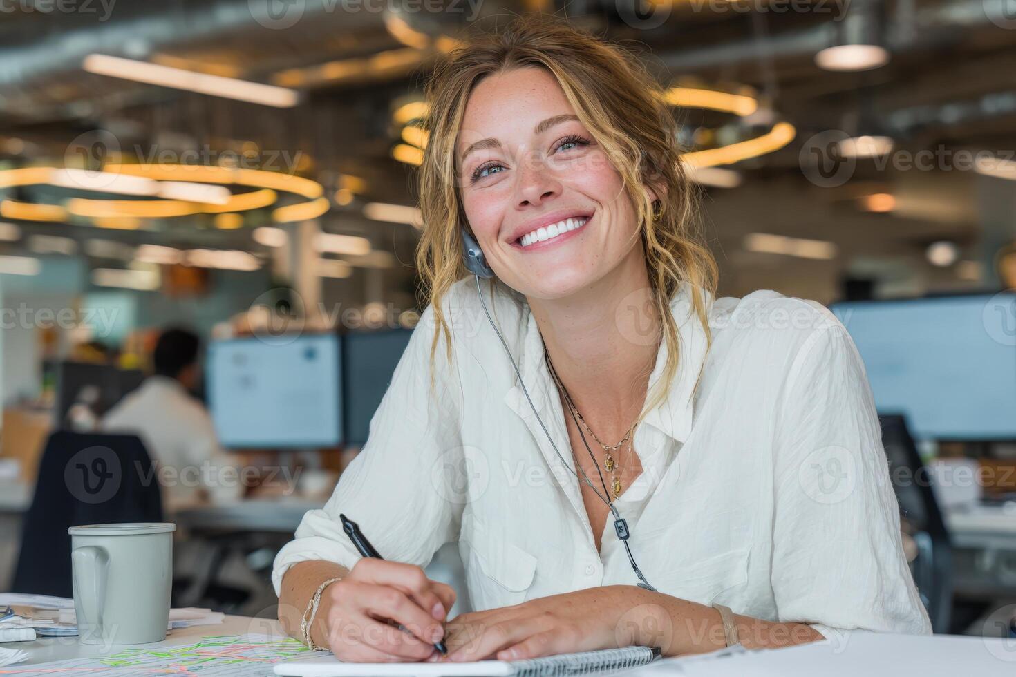 Smiling woman with wavy hair is sitting at a desk in a modern office, writing notes in a notebook, surrounded by technology and a collaborative workspace atmosphere Pro Photo