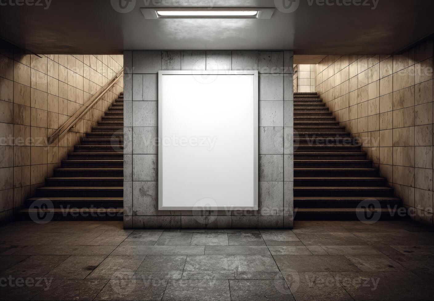 Empty subway station with two staircases leading up, featuring a large blank poster frame on the wall, ideal for advertising or promotional content with copy space Pro Photo