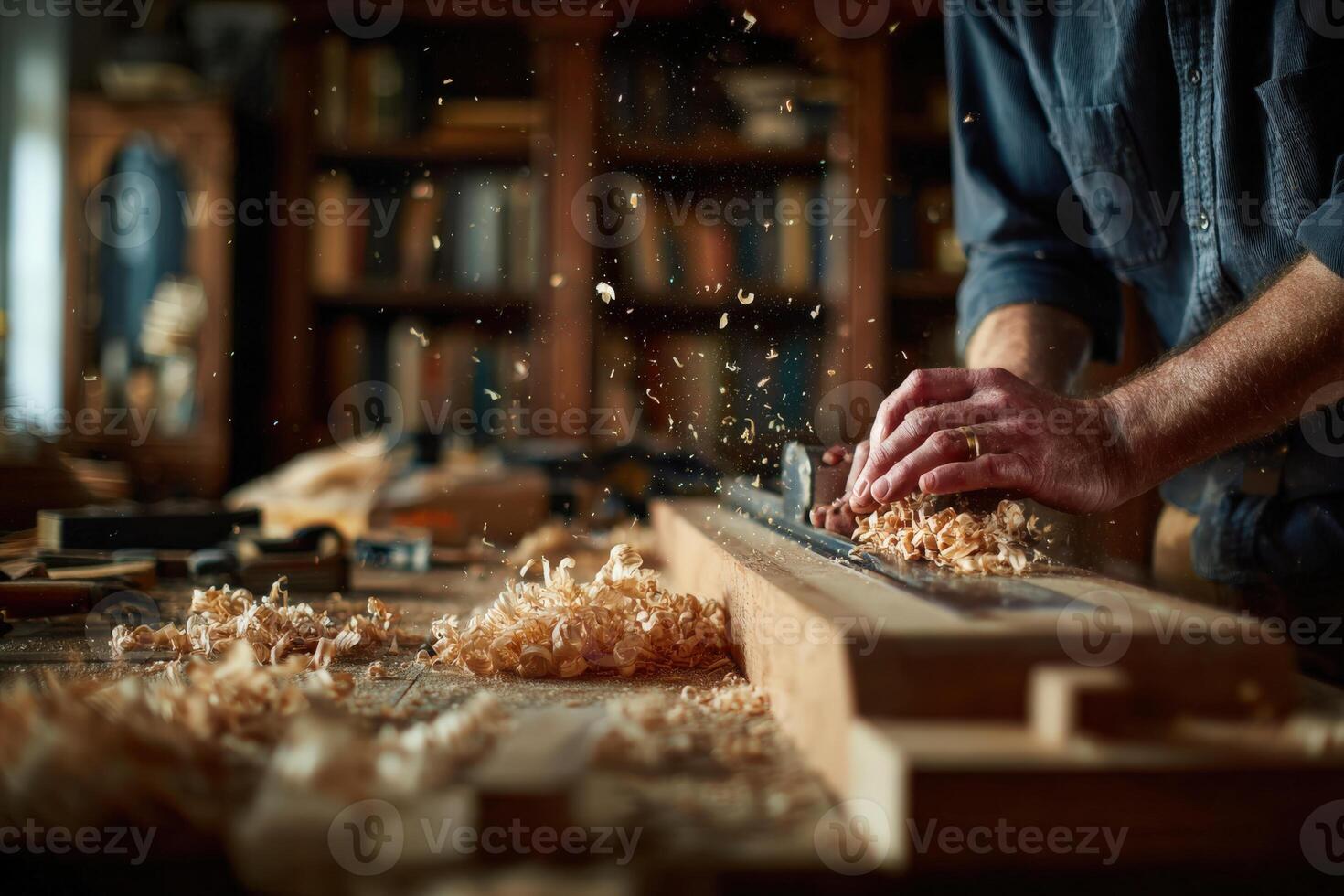 Skilled carpenter using hand plane to shape wood, surrounded by shavings and tools in a rustic workshop, showcasing craftsmanship and dedication to woodworking Pro Photo