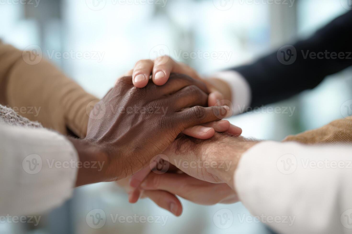 Diverse group of hands, including dark skin and light skin, stacked together in a gesture of unity and collaboration, symbolizing teamwork and solidarity in a professional environment Pro Photo