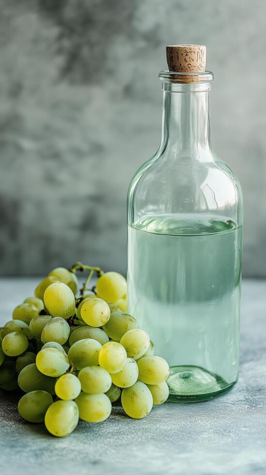 Grape cluster beside clear bottle with cork against a soft gray background. photo