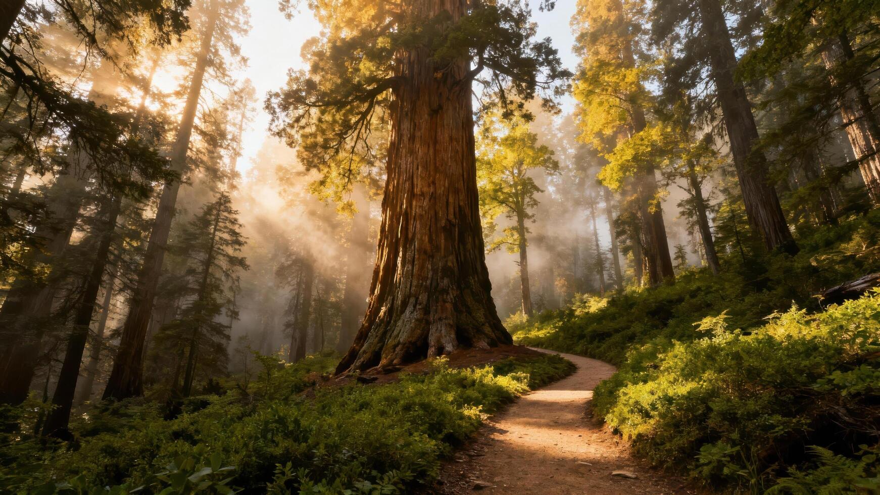 Sunlight streams through the canopy illuminating a winding path next to a massive, ancient tree in a dense forest photo